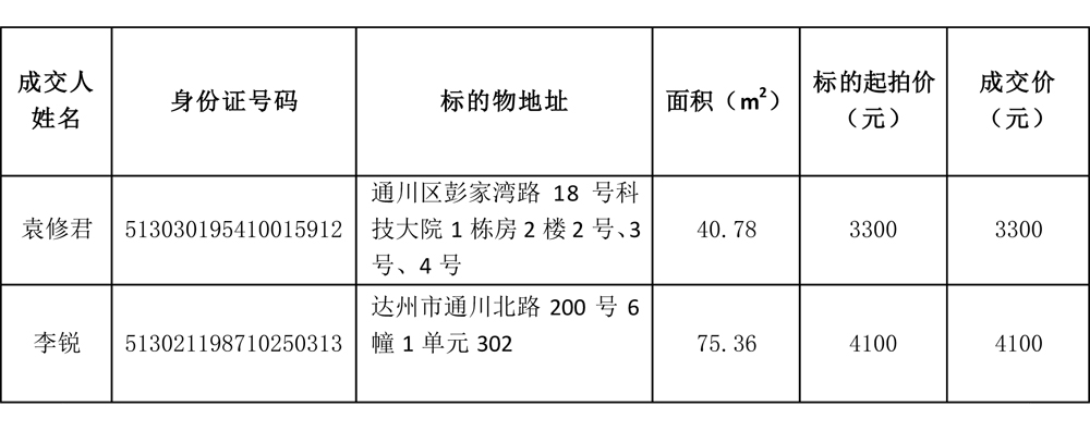 按照市國資委《關(guān)于印發(fā)達州市屬國有企業(yè)資產(chǎn)出租管理辦法的通知》(達市國資委發(fā)〔2019〕251號)相關(guān)規(guī)定,達州市投資有限公司于2023年11月3日以現(xiàn)場競價方式在達州市投資有限公司5樓會議室對參與報名的2宗國有資產(chǎn)進行公開競價,現(xiàn)將成交結(jié)果公示如下: